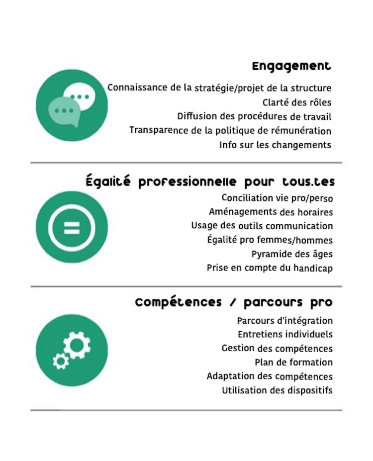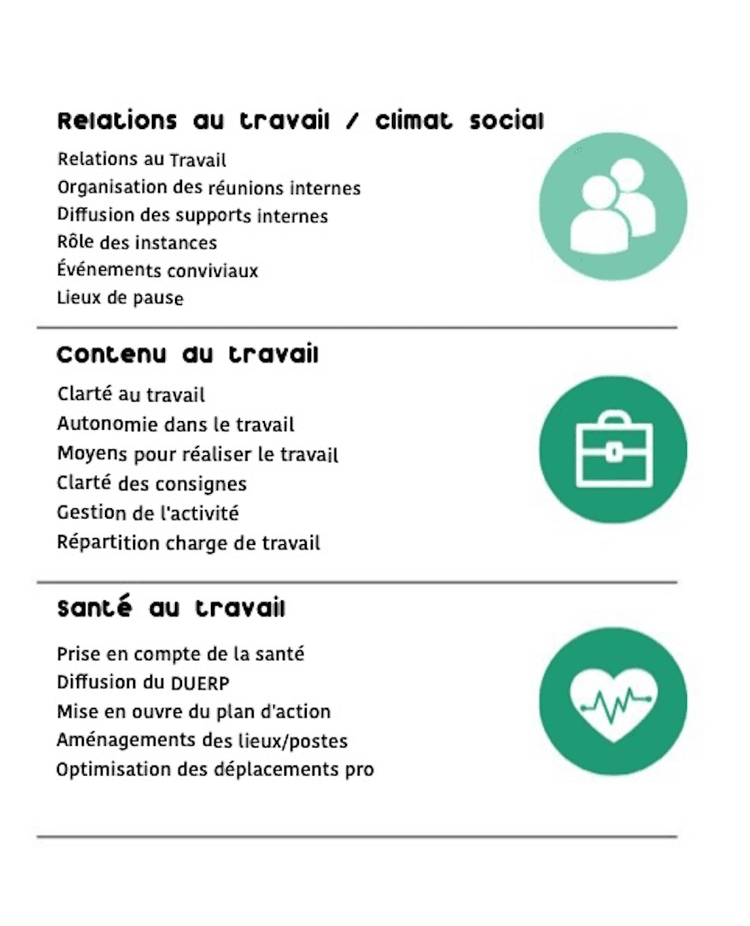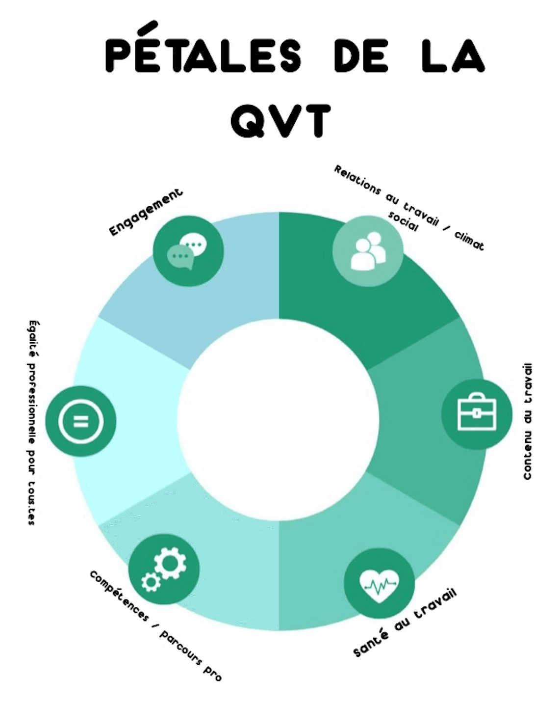 Relations au travail et climat social (réunions, communication interne, événements conviviaux), Contenu (clarté dans le poste et autonomie), Santé (risques psychosociaux, DUERP), Compétences et parcours (gestion des compétences et des formations), Engagement (transparence, implication dans la stratégie et le projet), Egalité professionnelle pour tous.tes (conséquence de tout le reste), les six pétales de la fleur QVCT méritent d’être arrosés de connaissances, afin de mieux gérer l’ici le maintenant tout en mesurant les perspectives d’avenir. Il en va globalement du respect des valeurs, du partage du projet, de l’efficience de l’activité, individuellement et collectivement, de la pérennité de l’entreprise.