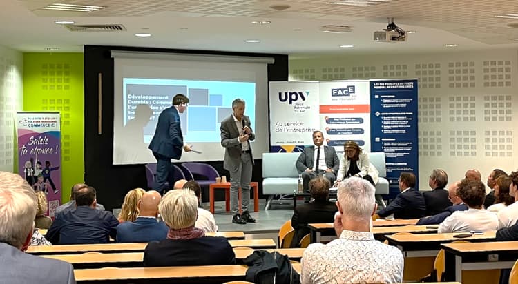L’Union Patronale du Var et Face Var ont tendu la main aux responsables français de cette « plus grande initiative de durabilité des entreprises au monde », dans le cadre de leurs rendez-vous de la RSE, conviant la CCI à la table des échanges, le 17 septembre dans l’amphithéâtre bien rempli de l’Ecole de la 2e Chance (groupe UPV), à La Garde. Un joli clin d’œil pour la défense de notre bien commun, considérant qu’il n’y a pas de 2e chance pour le climat ! Stéphane Benhamou, président adjoint de l’UPV représentant la présidente Véronique Maurel, a accueilli en connaisseur de ces questions Nils Pedersen, délégué général du Réseau France du Pacte, les débatteurs et les nombreux dirigeants d’entreprises présents. Mettant en partage avec ses confrères entrepreneurs les valeurs de droits de l’homme, de travail normé, de développement durable ou encore de lutte contre la corruption, il a revendiqué à sa façon la nécessité de faire suivre les paroles par des actions. « Il faut que les faisouses surpassent les dissouses », a-t-il ainsi déclaré avec un certain succès, déclinant l’expression québécoise usitée par le président national du MEDEF Patrick Martin, « les bottines doivent suivre les babines » (Stéphane Benhamou est aussi président du MEDEF Var). Nathalie Alexandre a plaidé ensuite avec force et passion l’engagement de Face Var qu’elle préside dans les causes défendues par le Pacte, sachant qu’elle est très impliquée sur ces sujets et d’autres encore au sein du réseau Enedis dont elle est la directrice dans le Var.