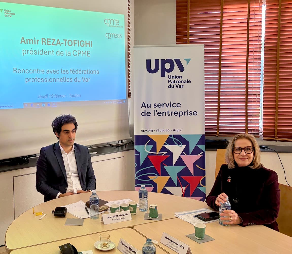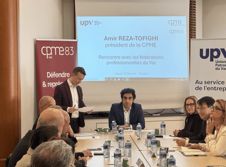 Le président national de la CPME, Amir-Reza Tofighi, s’est rendu dernièrement au sein de l’Union Patronale du Var, à Toulon, à l’invitation de la présidente Véronique Maurel, afin de débattre avec les branches, fédérations professionnels et élus de l’UPV dans les territoires.